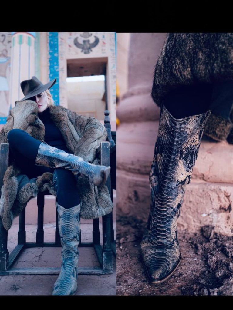 Семья исследовала дюны верхом на верблюдах, одетая в специальную конную экипировку для защиты от песка. На закате Мадонна позировала у пылающего костра в объемном коричневом пальто из искусственного меха и элегантном шарфе. На фоне исторических колонн и местных достопримечательностей она экспериментировала с ковбойским стилем, включающим широкополую шляпу, обтягивающие брюки и кожаные сапоги. Также она снялась во всем черном возле золотой статуи.
