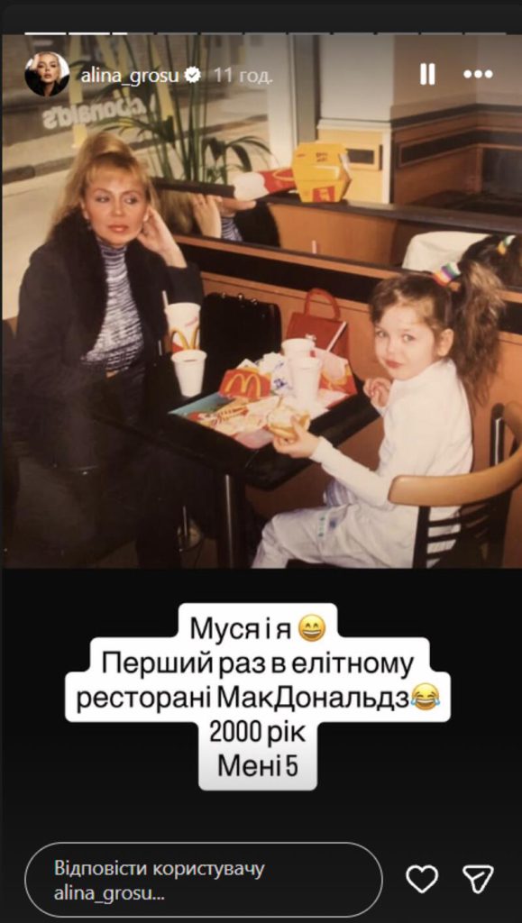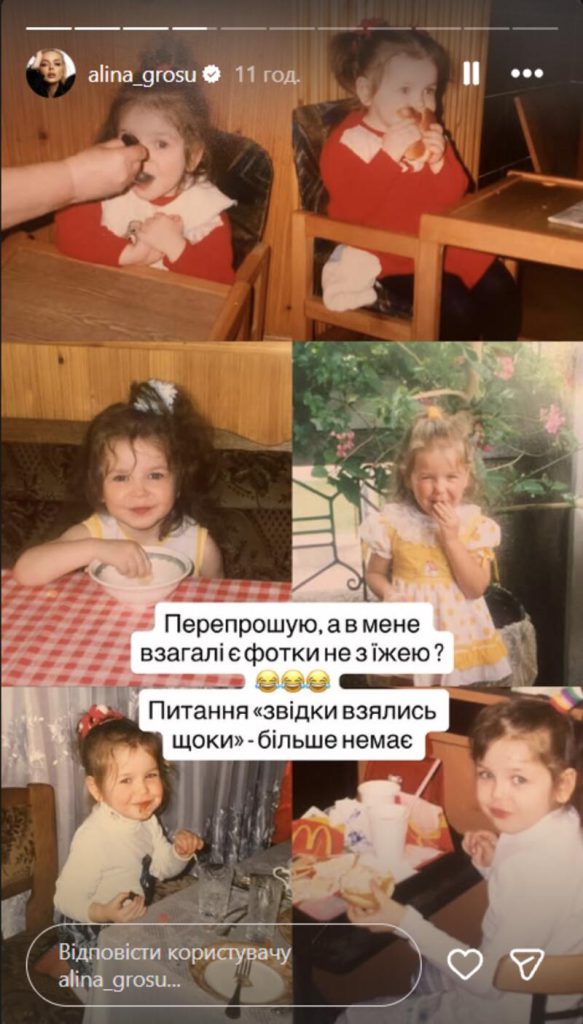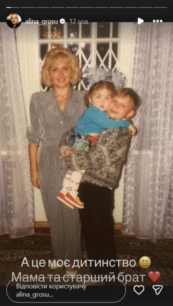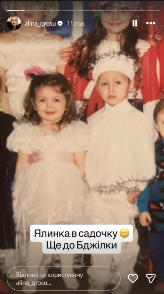 На первом снимке маленькая Алина в домашней обстановке позировала на руках у старшего брата, а рядом с ними стояла их мама Анна Андреевна. Затем исполнительница запостила кадр, где она позировала в белом платье на новогоднем празднике в детском саду. В подписи Гросу пошутила, что эта съемка была еще до выхода ее трека «Бджілка».