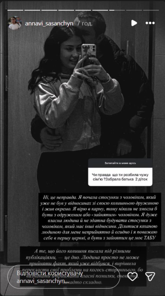 Читайте также: Экс-жена Сасанчина отреагировала на слухи, что стала причиной распада чужого брака
